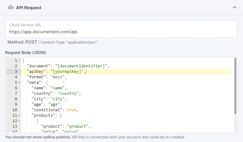 In template API Panel you can create new document using JSON Editor or preview how to create proper API Request for specific template
