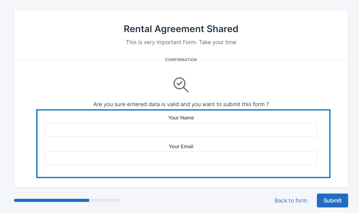 If this option is selected, submitter will have to provide his/her email and name before form is fully submitted. This data will be send to “Email After Submission” together with document.
