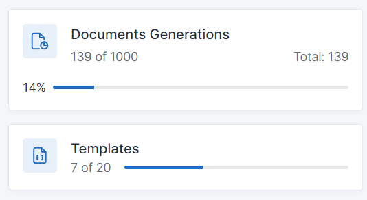You can find usage indicators on the dashboard page, showing your current position within the limit. The limit depends on your selected free or paid membership plan. Once the limit is exceeded, the Documentero service will be temporarily unavailable (hard stop). To continue using the service, you should consider upgrading to a higher plan.